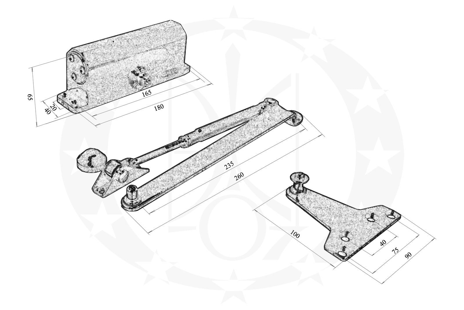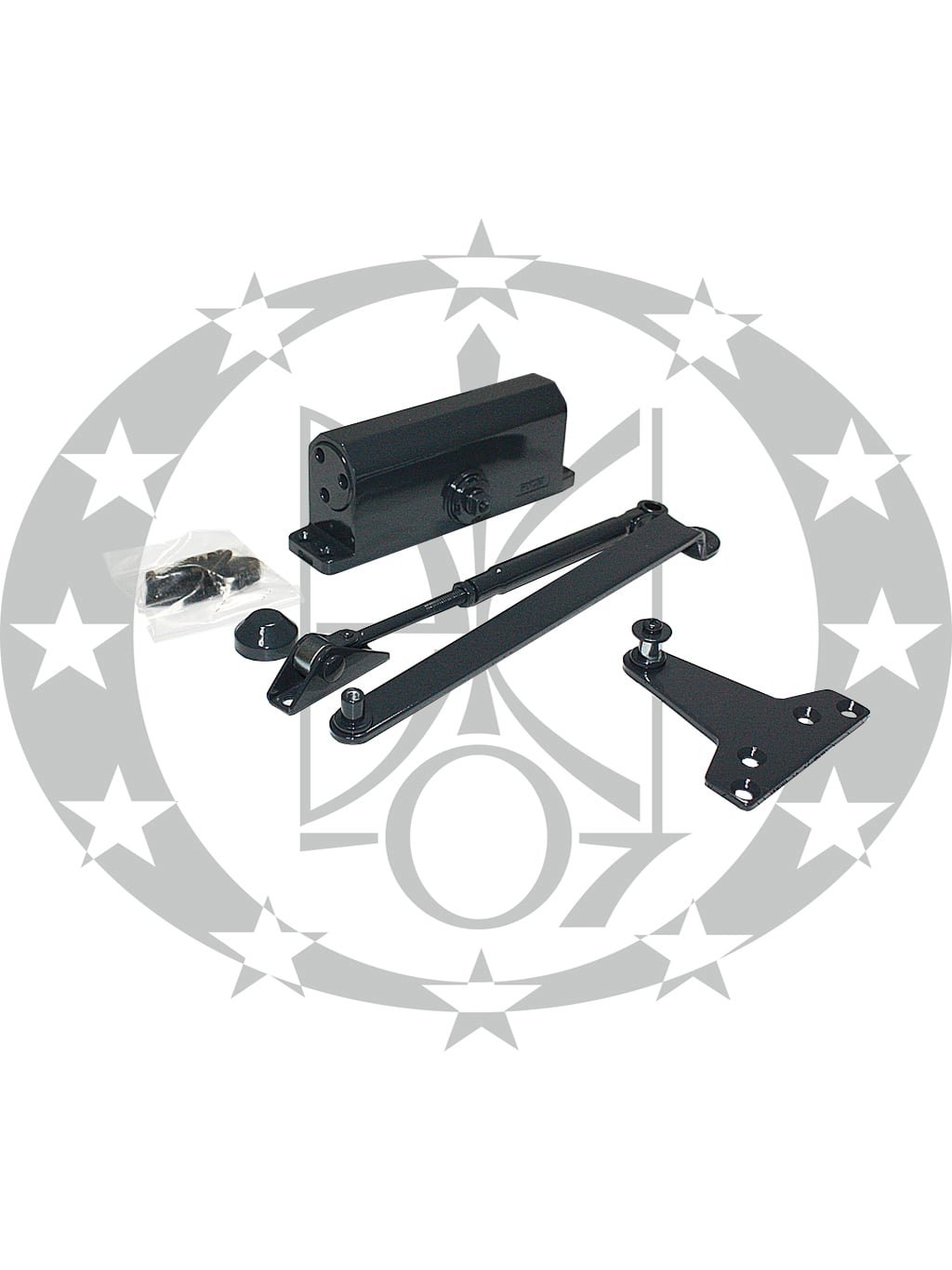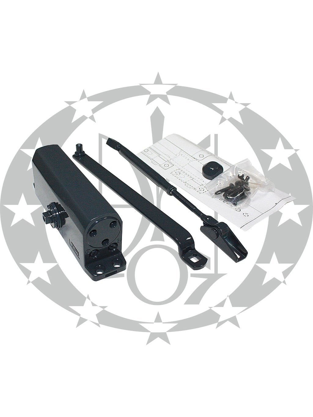 В комплектацію дотягувача входять кріпильні елементи та трафарет необхідні для його встановлення.