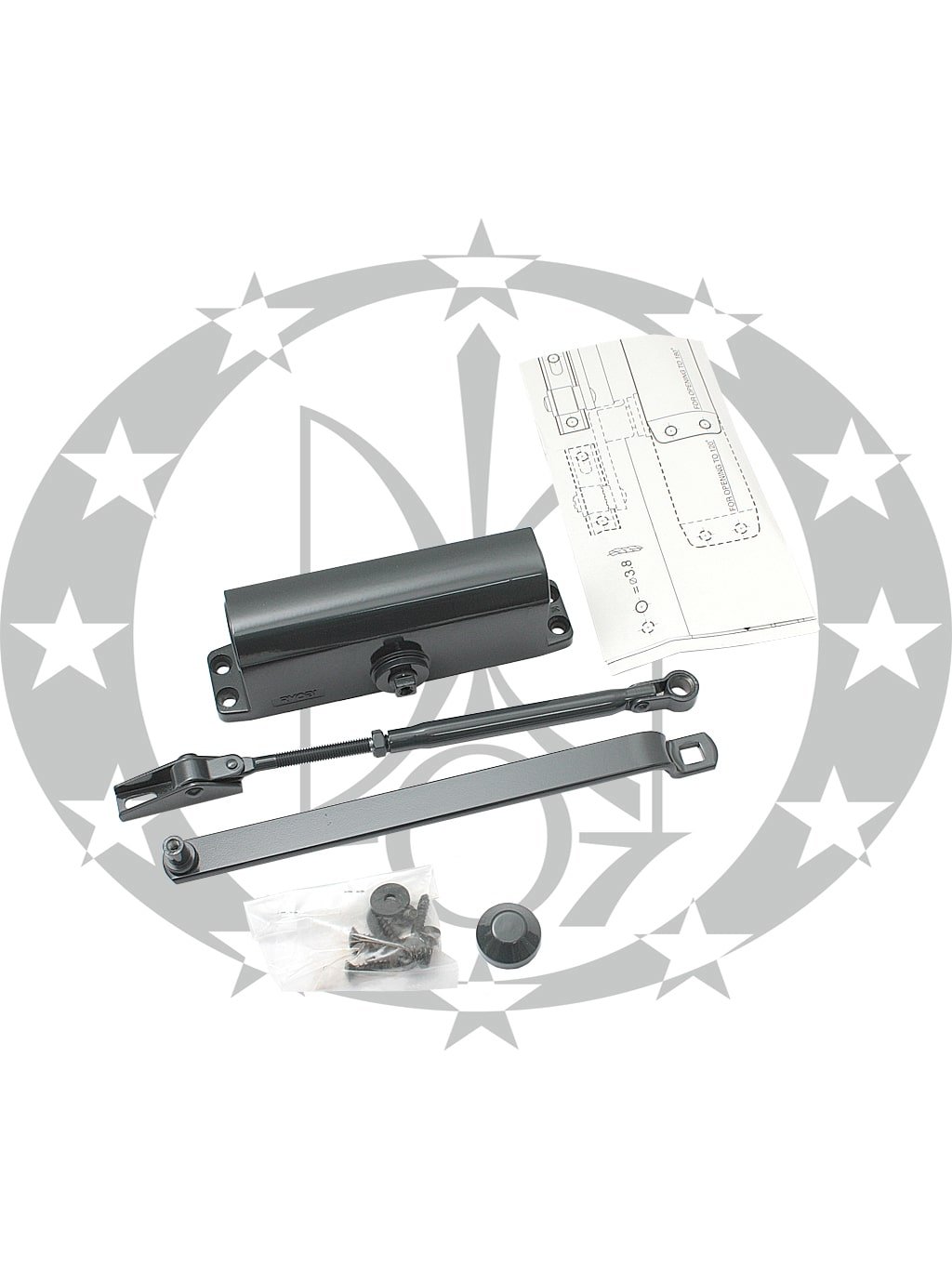 В комплектацію дотягувача входять кріпильні елементи та трафарет необхідні для його встановлення.