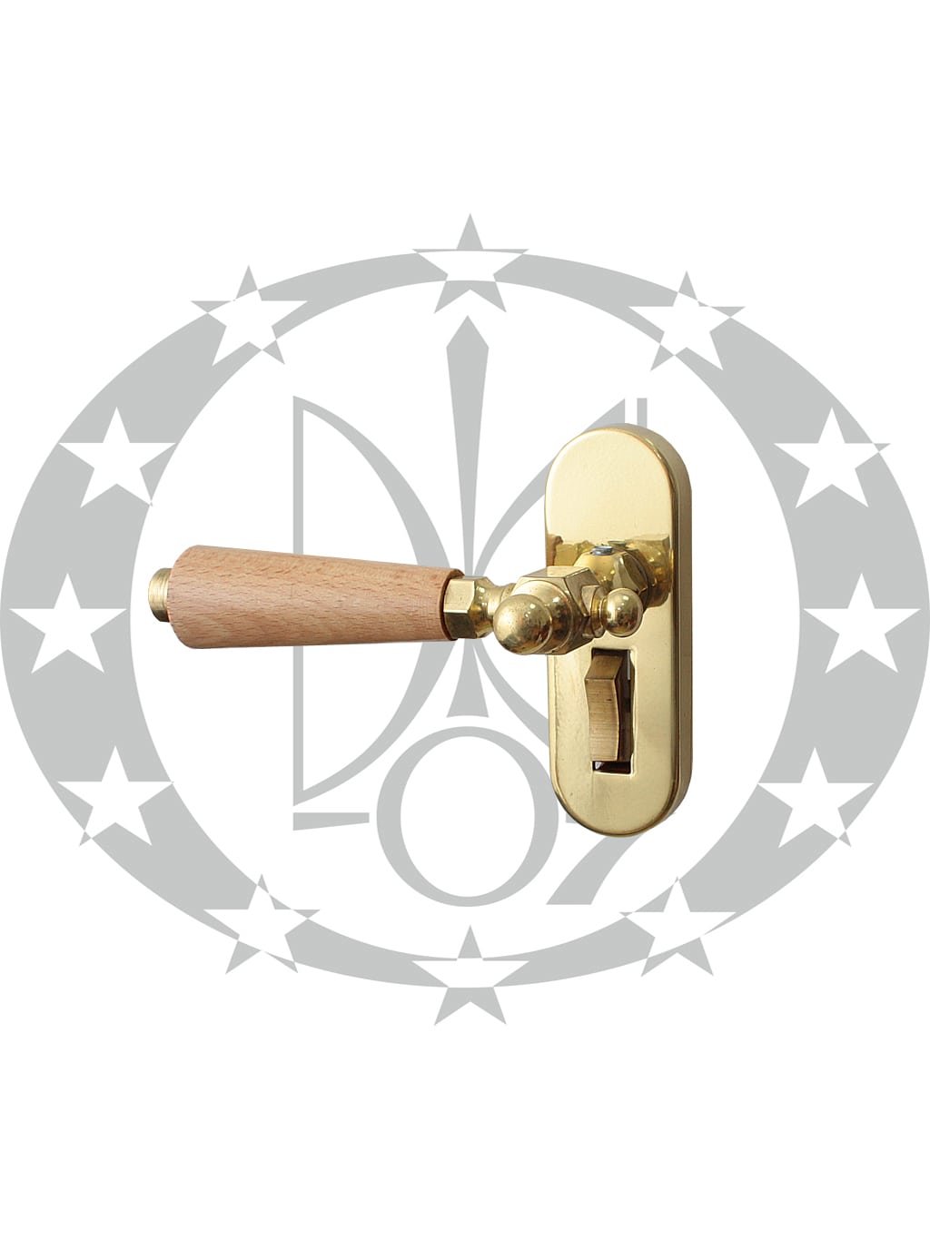 Ручка Дерево з фіксатором світла – натискна ручка польського виробництва на довгій планці з фіксатором. Ручка виготовлена з комбінації латуні та дерева.