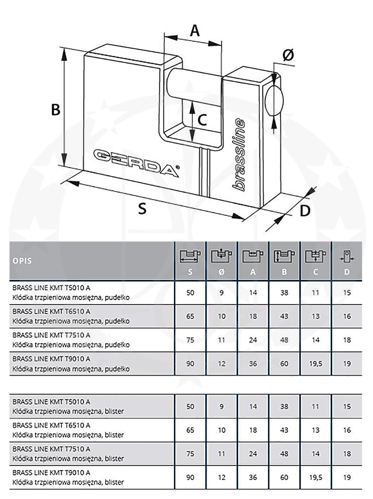 Замок виконаний в міцному корпусі з твердої латуні та дужкою з гартованої сталі. GERDA KMT-90 оснащений механізмом з двостороннім блокуванням.