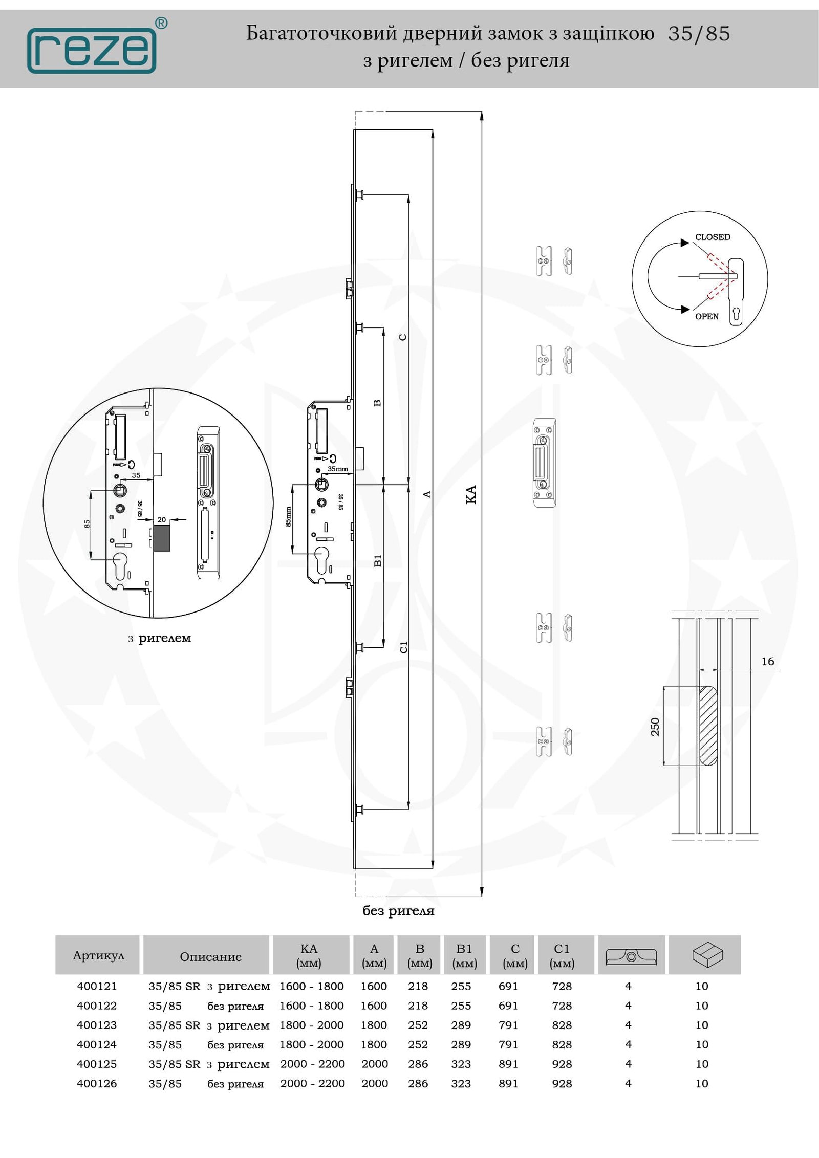 Замок REZE 85/35 PZ листовий (1600 з ригелем) – врізний рейковий механізм німецького виробника Reze для профільних металопластикових та дерев’яних дверей.