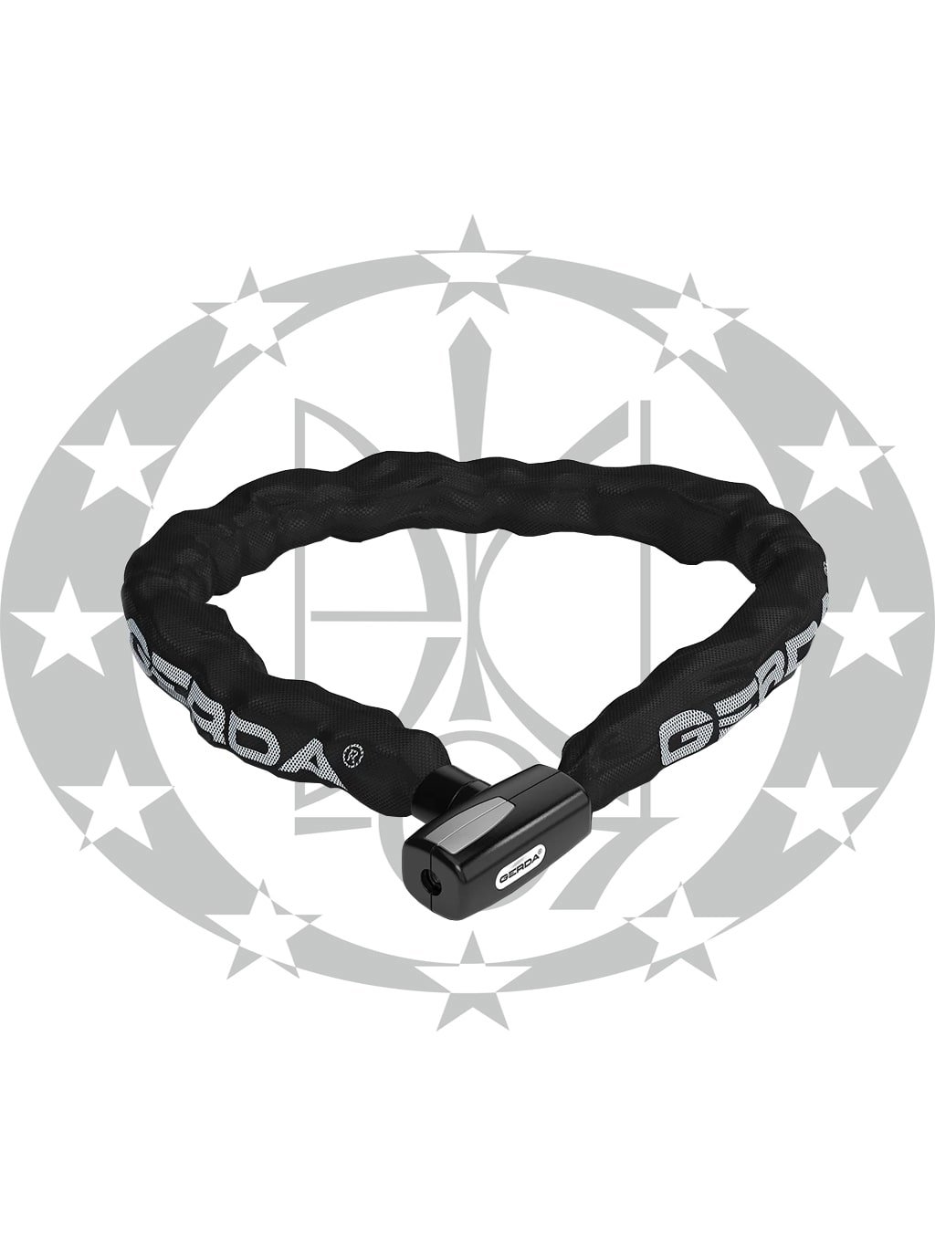 Навісний замок для велосипедів GERDA CONTRA 900/10W – захисний велосипедний ланцюг – класика серед захисних пристроїв для велосипедів. Велосипедний замок CONTRA 900/10W є загартованим ланцюгом довжиною 90 см з армованої сталі із блокуючим пристроєм оснащеним серцевинним механізмом. Ланцюг виготовлений із гартованої сталі товщиною 10 мм круглого перерізу, вкритий гальванічним покритям і захищений текстильним захисним кожухом. Навісний замок для велосипедів GERDA CONTRA 900/10W має спеціальну заглушку для ключа, яка захищає від пилу, піску, бруду та будь-якого іншого бруду. Замок покритий надійним пластиковим покриттям, яке захищає корпус від подряпин і поглинає випадкові удари. У комплекті зручний симетричний ключ. Це технологічне рішення дозволить легко відкрити замок у будь-якому положенні, забезпечуючи комфорт використання навіть у темряві.