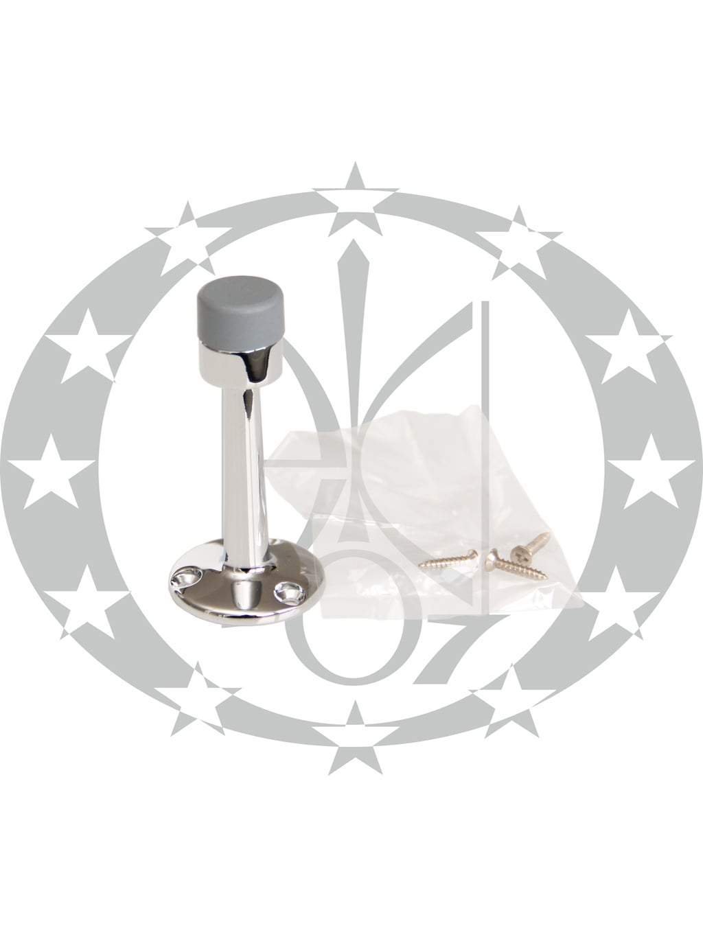 Обмежувач дверний стіна хром – виготовлений із сплаву ЦАМ та мякої гуми і вкритий гальванічним покриттям. Обмежувач монтується на вертикальну поверхню (стіну) за допомогою шурупів які йдуть в комплекті.