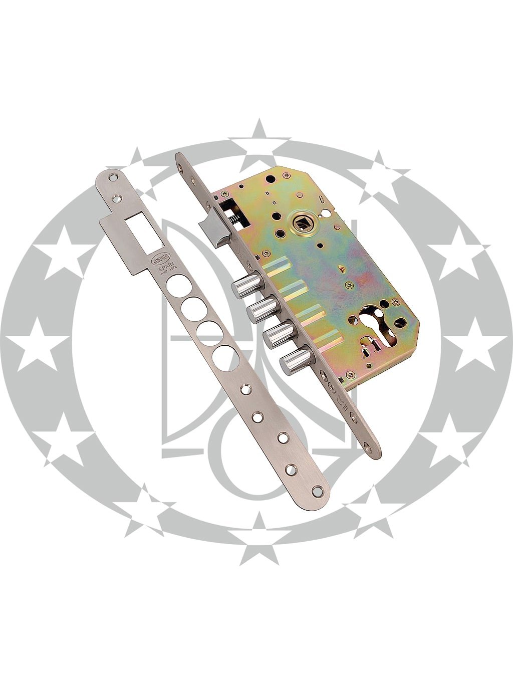 Замок AMIG mod.101 (18774) BASE 85/50 PZ нержавійка – врізний замок – механізм із засувкою іспанського виробника Amig під серцевину. Замок призначений для встановлення в дерев’яні або легкі металеві двері. Засувка призначена для використання з квадратом 8 мм.