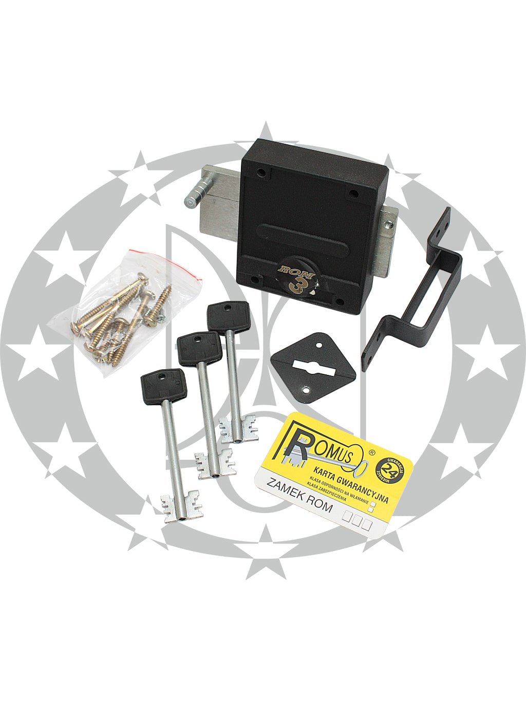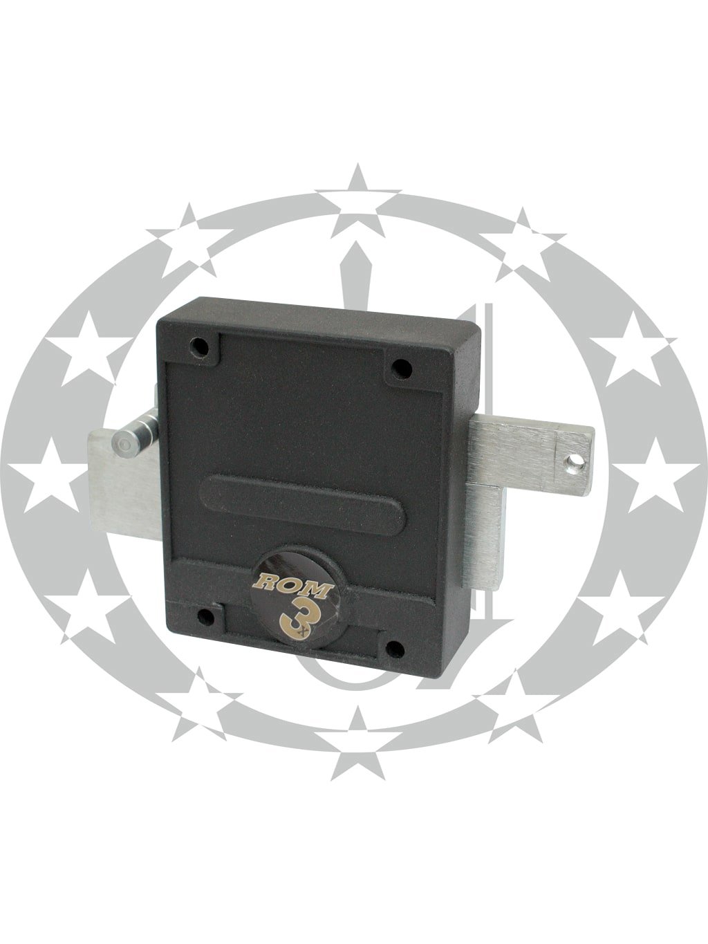 Замок накладний ROM 3X графіт – накладний сувальдний замок польського виробництва. Дана модель замка рекомендована для встановлення у металеві та дерев’яні двері гаражів, складів, ворота, та ін двері. Симетрична конструкція даного дозволяє встановлювати на двері із правою та лівою стороною відкривання. Механізм секретності даного замка відноситься до класу С. В конструкції присутня засувка, яка дозволяє замкнути двері зсередини без використання воротка. Гартовані сталеві шпильки запобігають спробам зрізання, а титанова пластина перешкоджає спробам висвердлювання елементів механізму.
