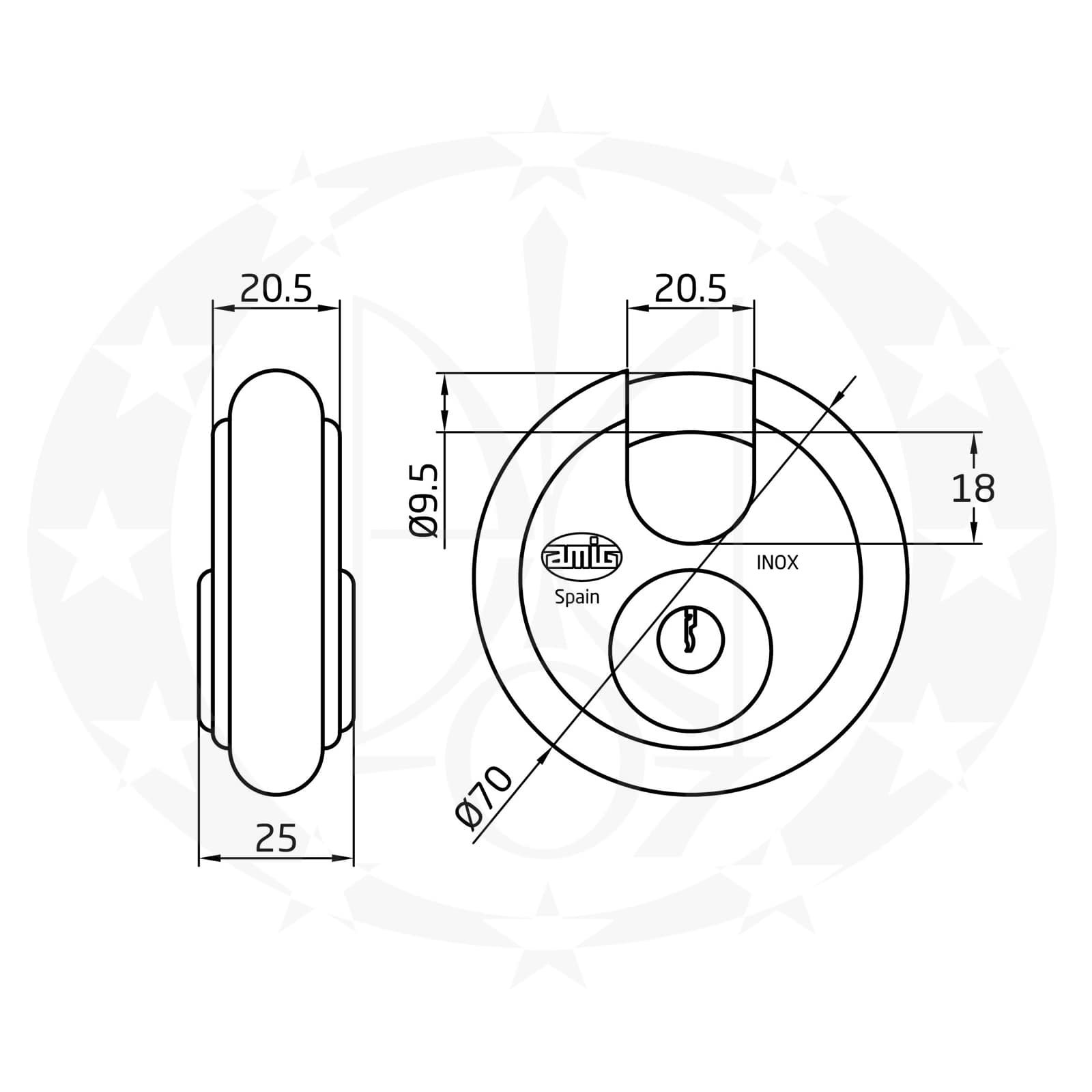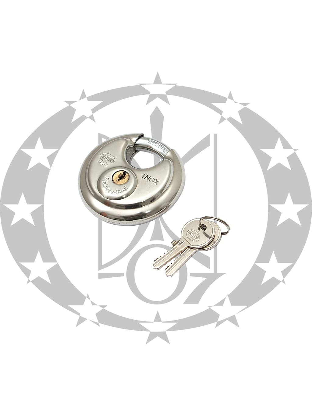 Замок навісний AMIG mod.350 (4891) круглий 2 ключі 70мм – навісний замок відомого іспанського виробника AMIG. Корпус замка виготовлений із нержавіючої сталі, а особлива дископодібна форма ускладнює спроби силового та слюсарного відкривання замка та надає додаткової міцності виробу в цілому. Дужка замка виготовлена із гартованої сталі та вкрита гальванічним покриттям. Механізм секретності відкривається з допомогою стандартного англійського ключа. В комплекті 2 ключі. Матеріал замка дозволяє використовувати його в приміщеннях з підвищеним рівнем вологості, та в агресивних атмосферних середовищах.