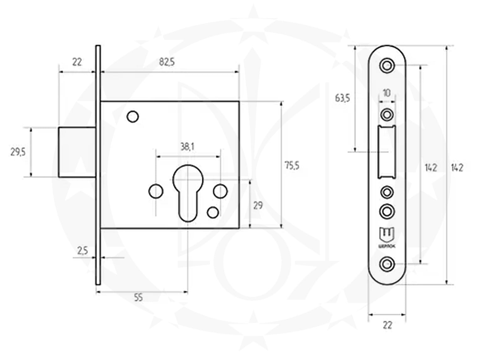 Замок ШЕРЛОК 05.755-ZNT /55 PZ врізний (аналог Сімферопіль ЗВ1-У-1.1) – додатковий врізний замок китайського виробництва для української торгової марки ШЕРЛОК. Дана модель рекомендована для встановлення в металеві чи дерев’яні двері в якості додаткового. Симетрична конструкція замка дозволяє встановлювати його в двері з правою та лівою стороною відкривання.