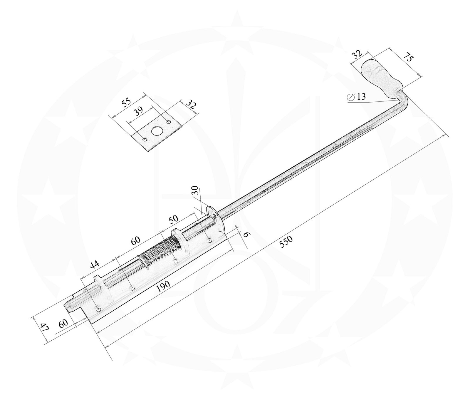 Засув виготовлений із сталі, стержень цинкований, а корпус вкритий порошковою фарбою. Ручка виготовлена із дерева.
