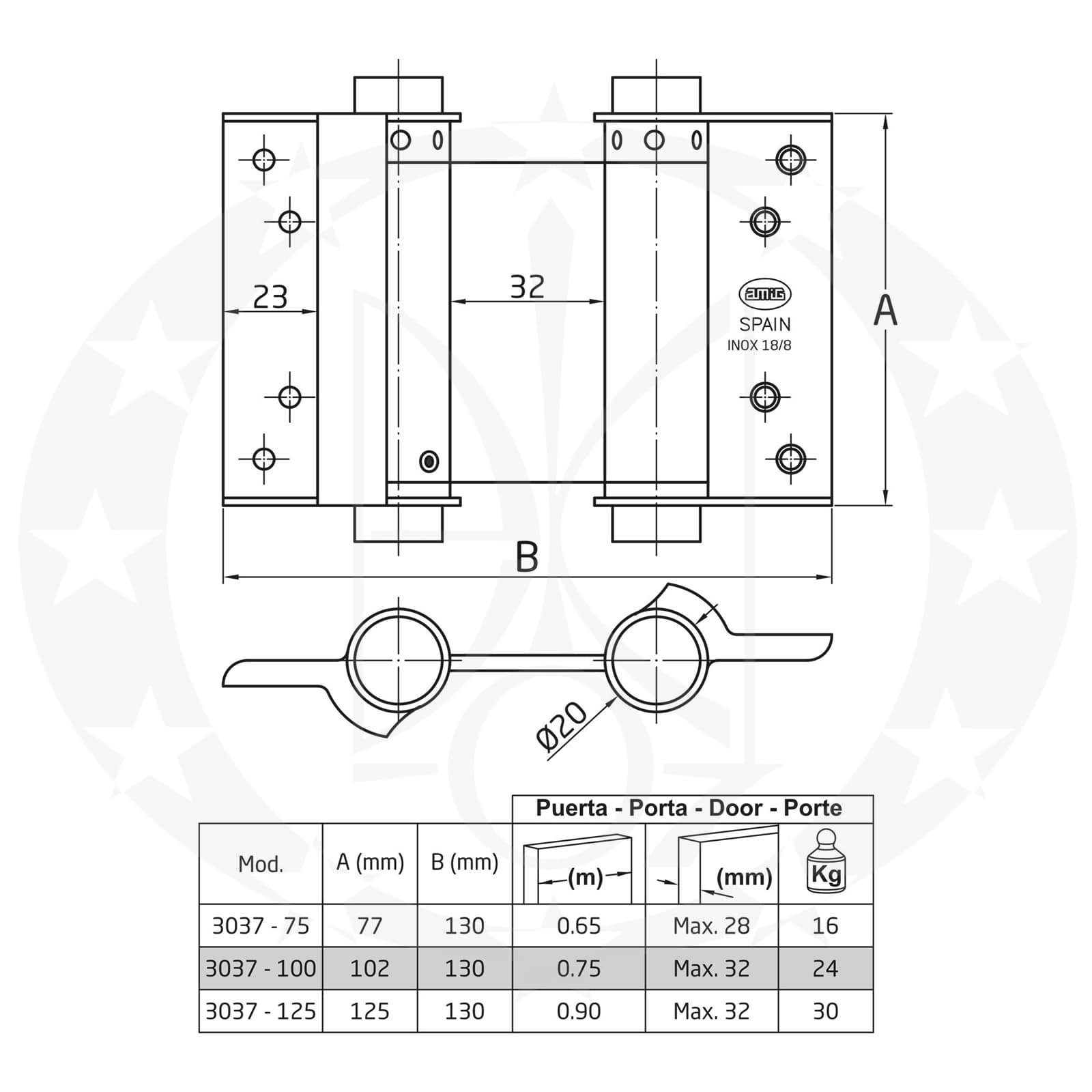 Завіс двосторонній AMIG mod.3037 нікель (9818) 100мм – двосторонній, маятниковий завіс відомого іспанського виробника AMIG. Завіс призначений для встановлення в двері із двостороннім відкриванням (“ковбойські двері”) в приміщеннях, де велика кількість відвідувачів (наприклад кухні закладів громадського харчування). Дана модель вирізняється тихой роботою та довговічністю.